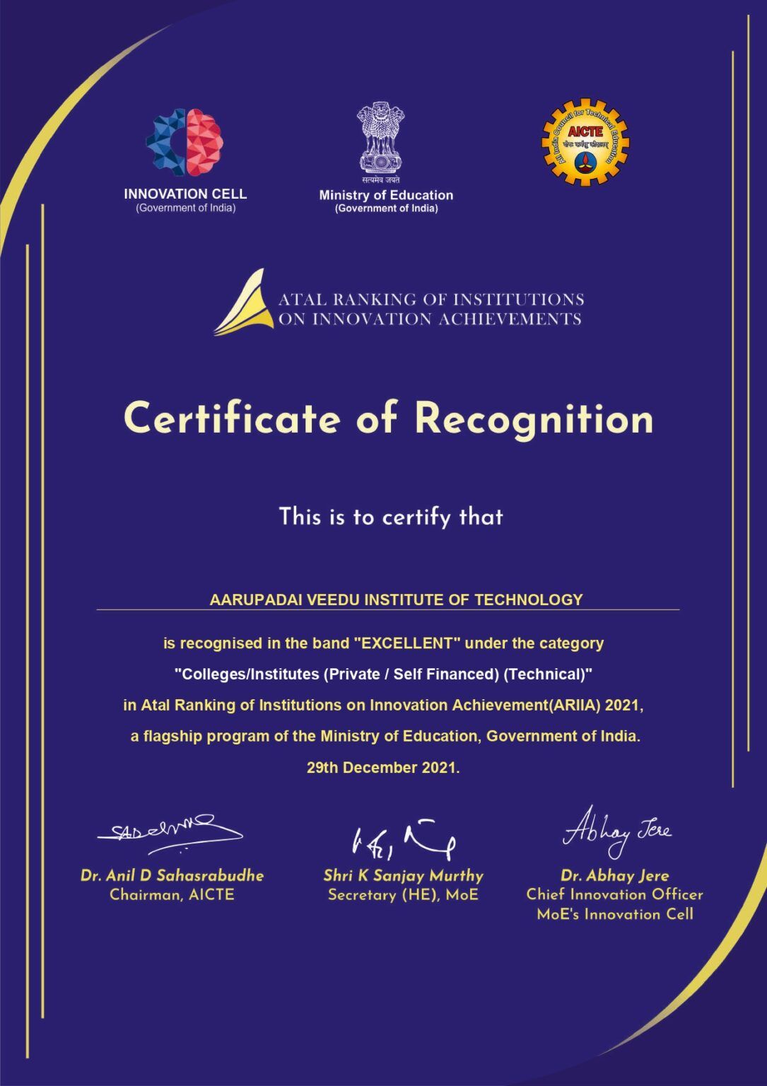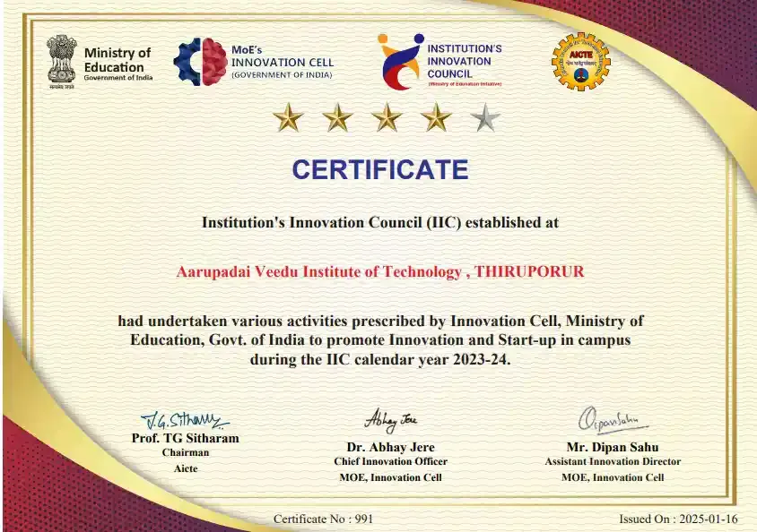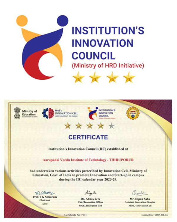 AVIT proudly continues its journey of excellence for the 5th consecutive year, earning top-rated recognition under IIC 6.0 (Institution’s Innovation Council) for the academic year 2023-24.