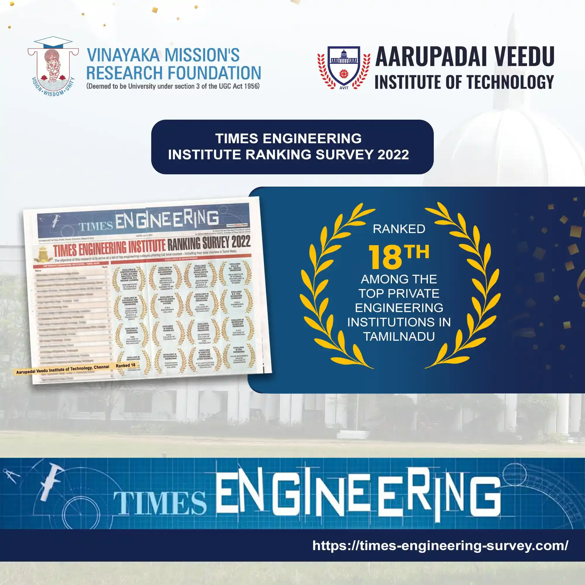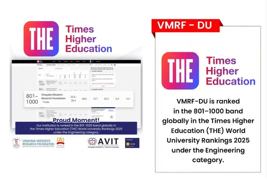 VMRF-DU is ranked in the 801–1000 band globally in the Times Higher Education (THE) World University Rankings 2025 under the Engineering category.